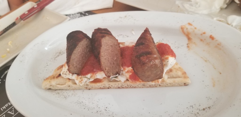 We woke up the day of our flight and decided to have lunch at a Cretan restaurant that was rated the best in Fira on trip adviser called Rakadiko MeRaki. The tapas style eatery served traditional Cretan cuisine. We tried some delicious specialties there like meatballs, Kebap, or lamb gyro with tomato sauce, and a cheese dip with hot peppers. The place lived up to its rep, and we enjoyed it so much that we ate there again when we returned to Santorini later on in the trip.